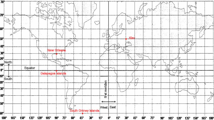 Give your answers in the following form: (...°N or S ; ..... ° E or W).