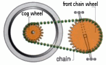 On a bike, there are several wheels at the chain transmission's level and several gear wheels at the back wheel's level. |